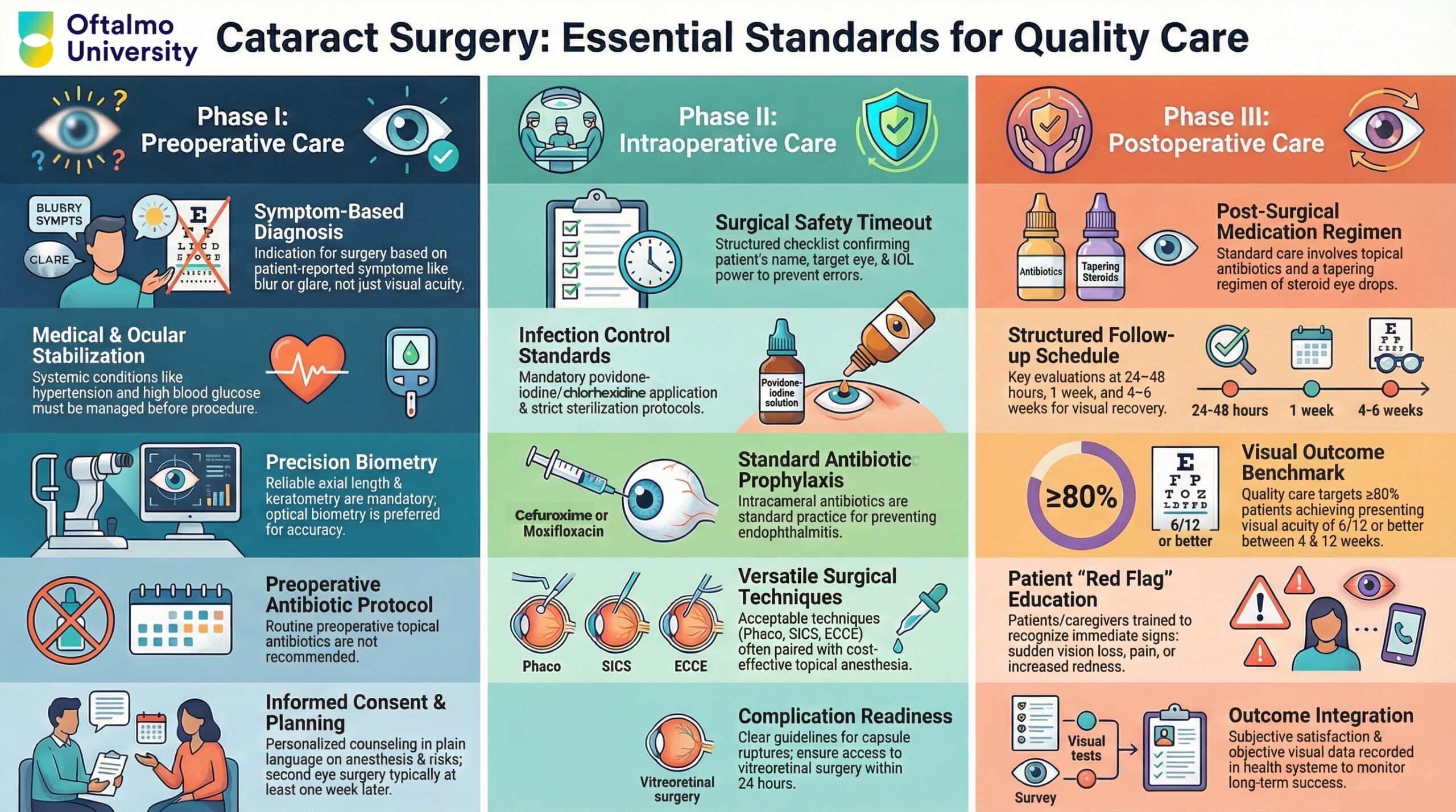 Quality cataract surgery begins long before the first incision. The WHO emphasizes that strong preoperative processes are central to both safety and visual outcomes CATA 9789240121089-eng.